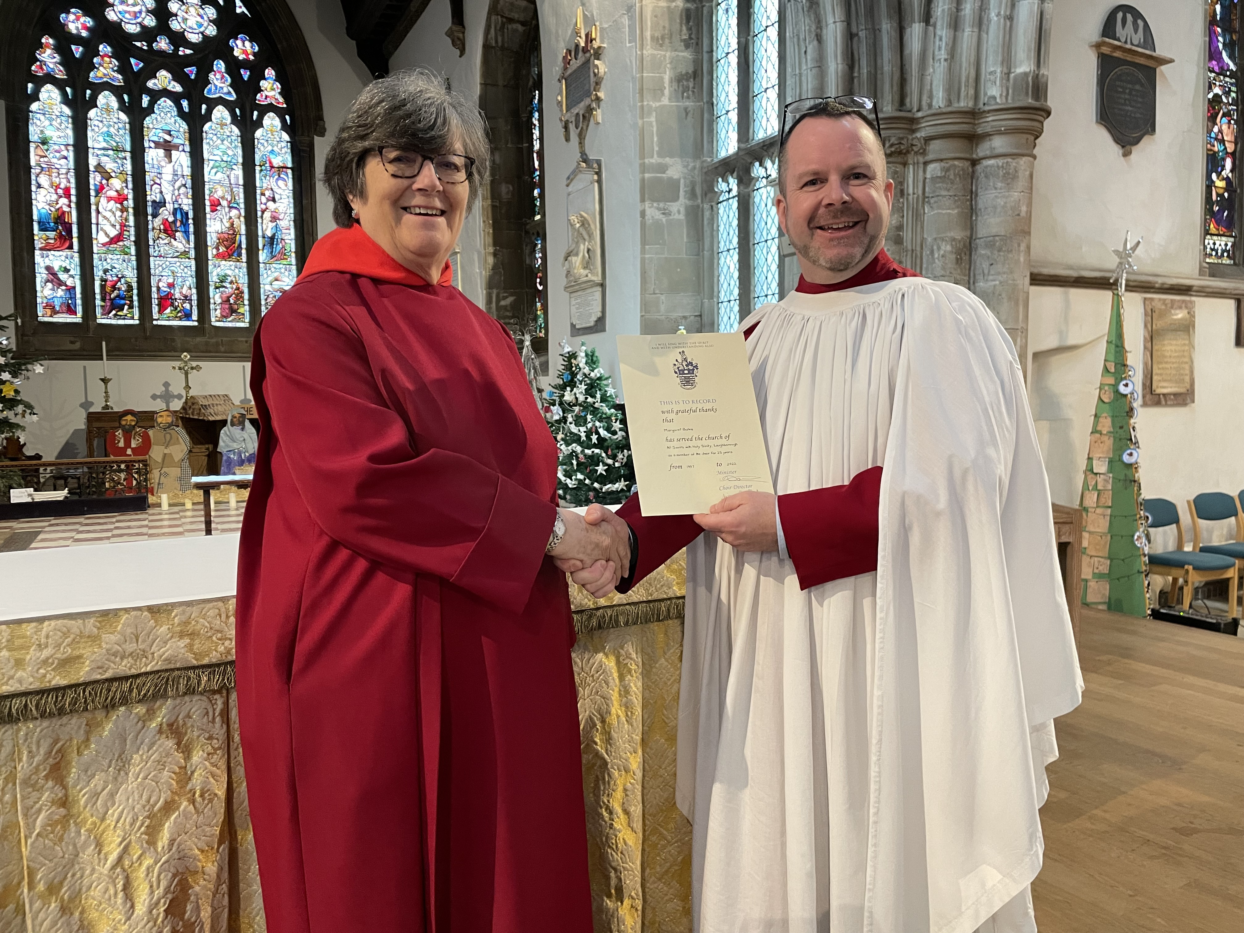 Choristers are particularly attracted to the RSCM Voice for Life awards scheme, and the Dean’s and Bishop’s Award, now called Bronze and Silver respectively. As an affiliated choir, it is possible to recognise long service as happened recently for one of our long serving choir members. Margaret Bates has sung in the choir for 25 years, a fantastic achievement and one the the choir celebrated earlier this year. She is pictured below receiving her certificate from Simon Headley.